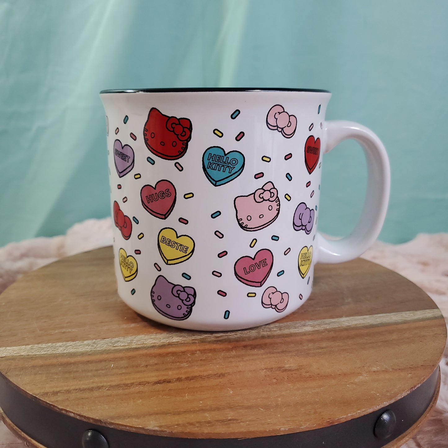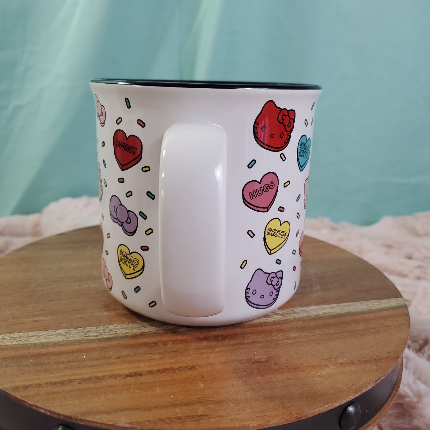 Hello Kitty, Valentine's Day, Ceramic Mug, Campfire Style, 20oz, Heart Shaped, Conversation Candies, Colorful Sprinkles, C Shaped Handle, Microwave Safe, Dishwasher Safe, White Mug, Pink Interior, Coffee, Tea, Hot Chocolate, Seasonal Mug, Cute Design, Joyful Sipping