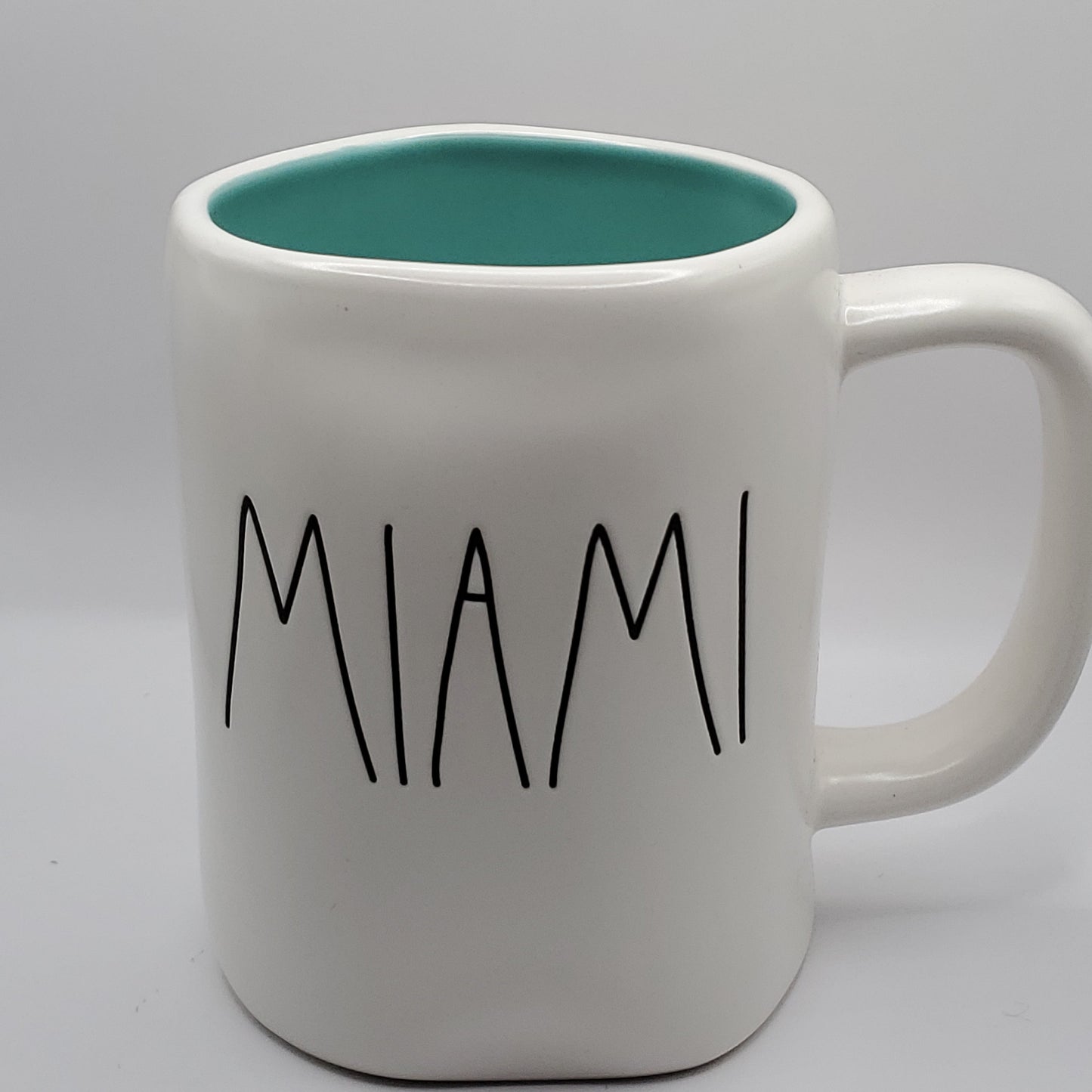 Rae Dunn MIAMI mug. White mug with black engraved lettering, teal color inside and palm tree image engraved in black on back.